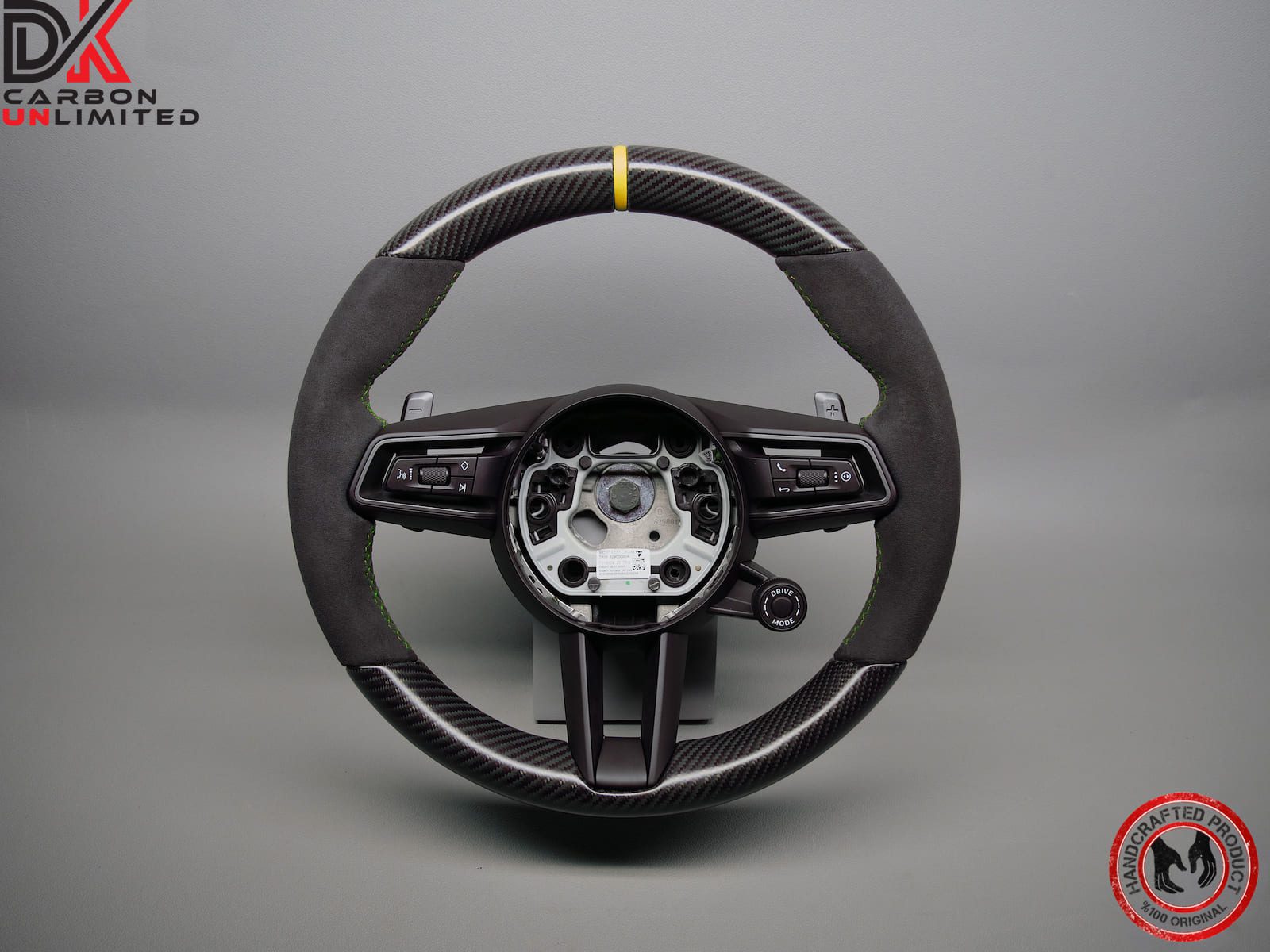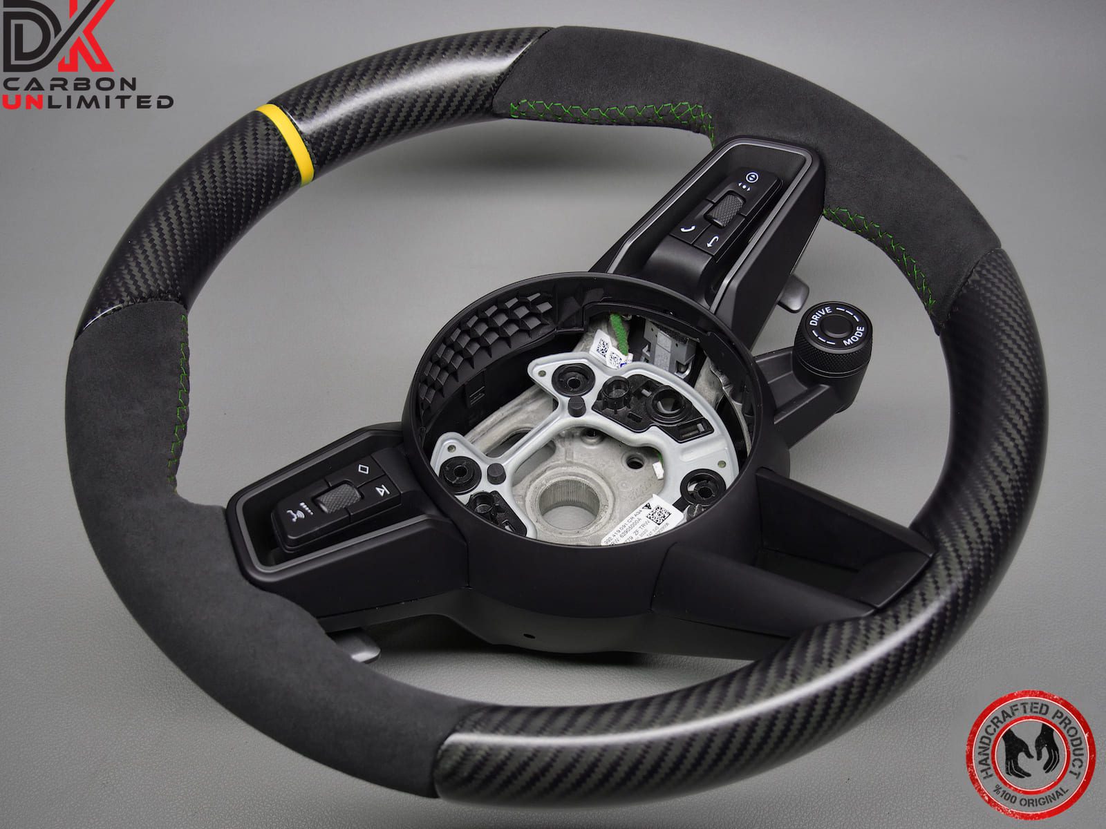 Porsche 992.2 GT3 RS 2023-24 992.2 GT3 2021-24 Yellow Leather Ring Green Stitch Alcantara Factory Trim Matching Matte Satin Finish Carbon Fiber Steering Wheel v.1.1